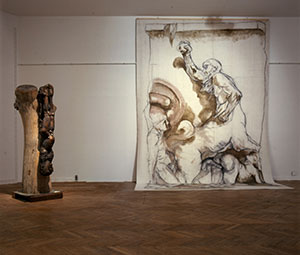 Erstmals sind im Künstlerhaus neben skulpturalen, graphischen und malerischen Werken Hrdlickas großformatigen Arbeiten für das Theater und die Oper zu sehen. Diese monumentalen Bühnenbilder, die für die Theater in Stuttgart und Bonn entstanden sind, werden in kompletter Größe präsentiert. Die Prospekte für Goethes "Faust" und Luigi Nonos Oper "Intolleranza 1960“ sind von immenser Wirkung ob der Kraft der figuralen Darstellung, die an die großen Freskenzyklen der Kunstgeschichte erinnert. In diesen riesigen, bis zu 9 x 15 Meter großen Bühnenbildern kommentiert der Künstler in figurenreichen Tableaux das dichterische Werk. Fern von Ausstattung und üblicher Bühnendekoration schafft Hrdlicka mit seinem Werk eine paralleles Schau-Spiel. Er erweitert den Anspruch der reinen schauspielerischen Wiedergabe des Werkes.