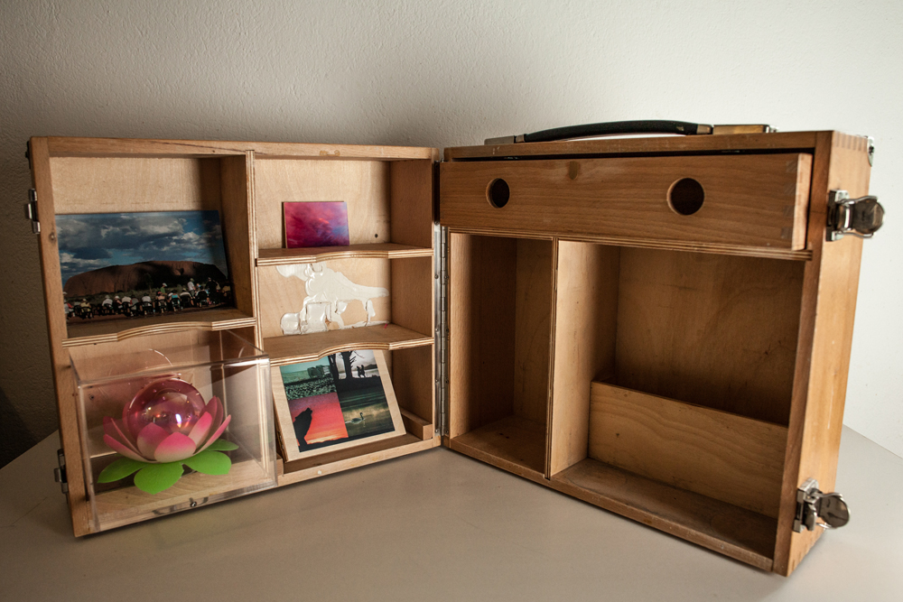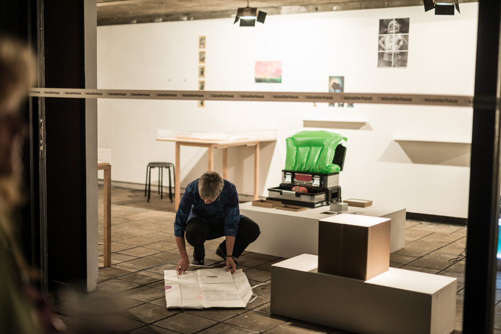 Spektrum reicht vom Nähkästchen über den Pilotenkoffer bis zur selbstgebauten Schachtel. Und jede von uns kuratiert ihre Werkbox thematisch, wofür sie eine kuratorische Einladung mit ihren Wünschen, Informationen, Maßangaben usw. formuliert und losgeschickt hat. Die Werkboxen sind unser Handgepäck, das für Interessierte gerne geöffnet wird.