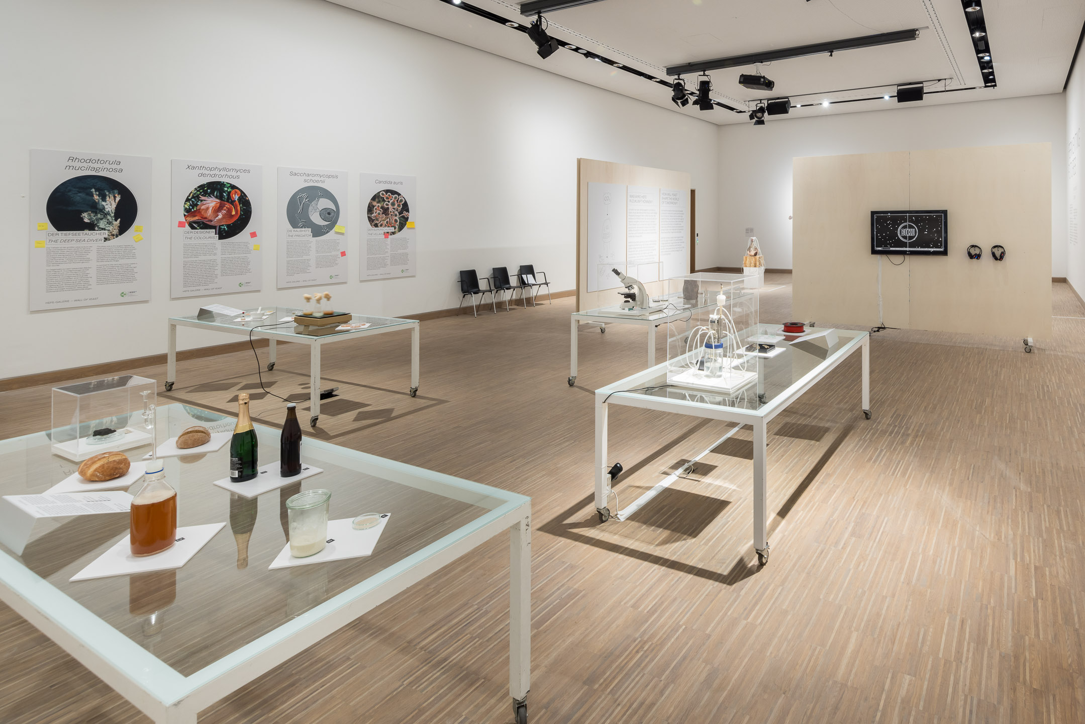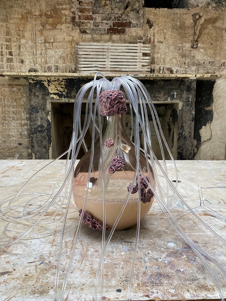 Die Arbeiten der beiden Künstler*innen spannen einen thematischen Bogen vom Klimawandel, CO2 Speicherung und der globalen Plastikverschmutzung der Erde, über Bio-Archäologie und Vergänglichkeit bis hin zur langen Koevolution von Mensch und Hefe.