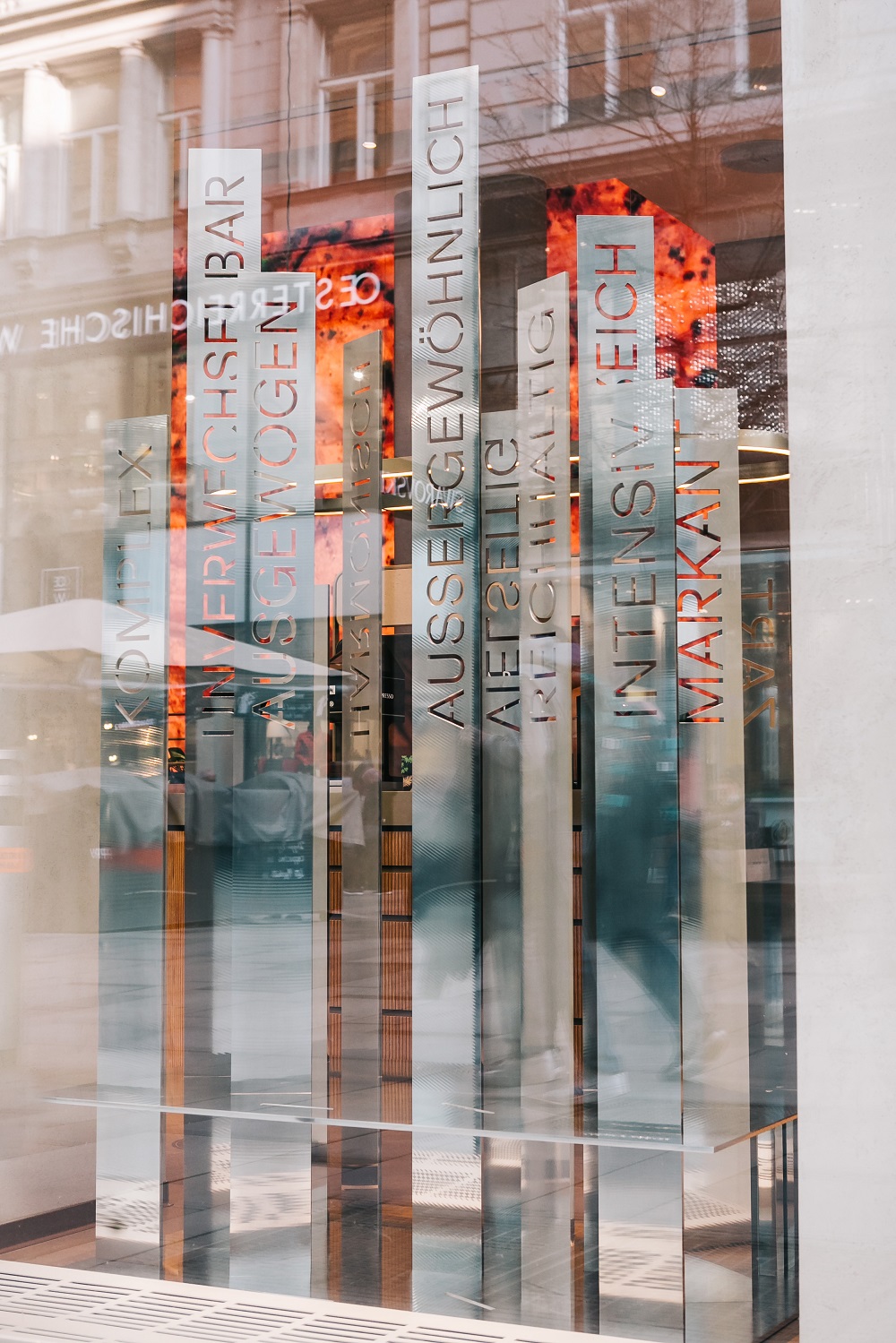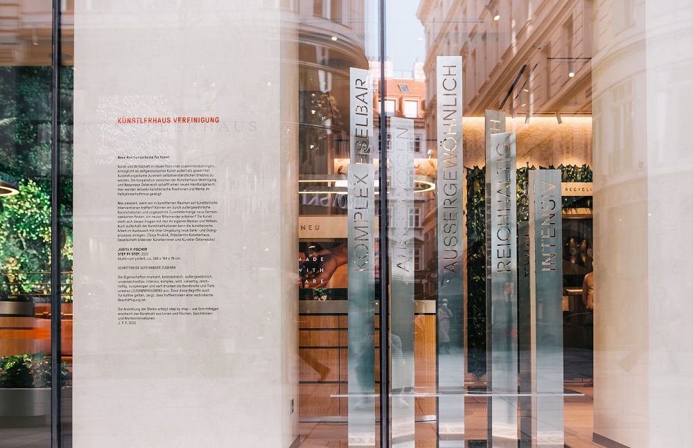 Diese Frage stellt sich unweigerlich den Besucher*innen der Wiener Innenstadt, wenn Sie in einer Auslage des Nespresso Ateliers in der Kärntnerstraße auf die schlanken Stelen aus Aluminium der Künstlerin Judith P. Fischer treffen.