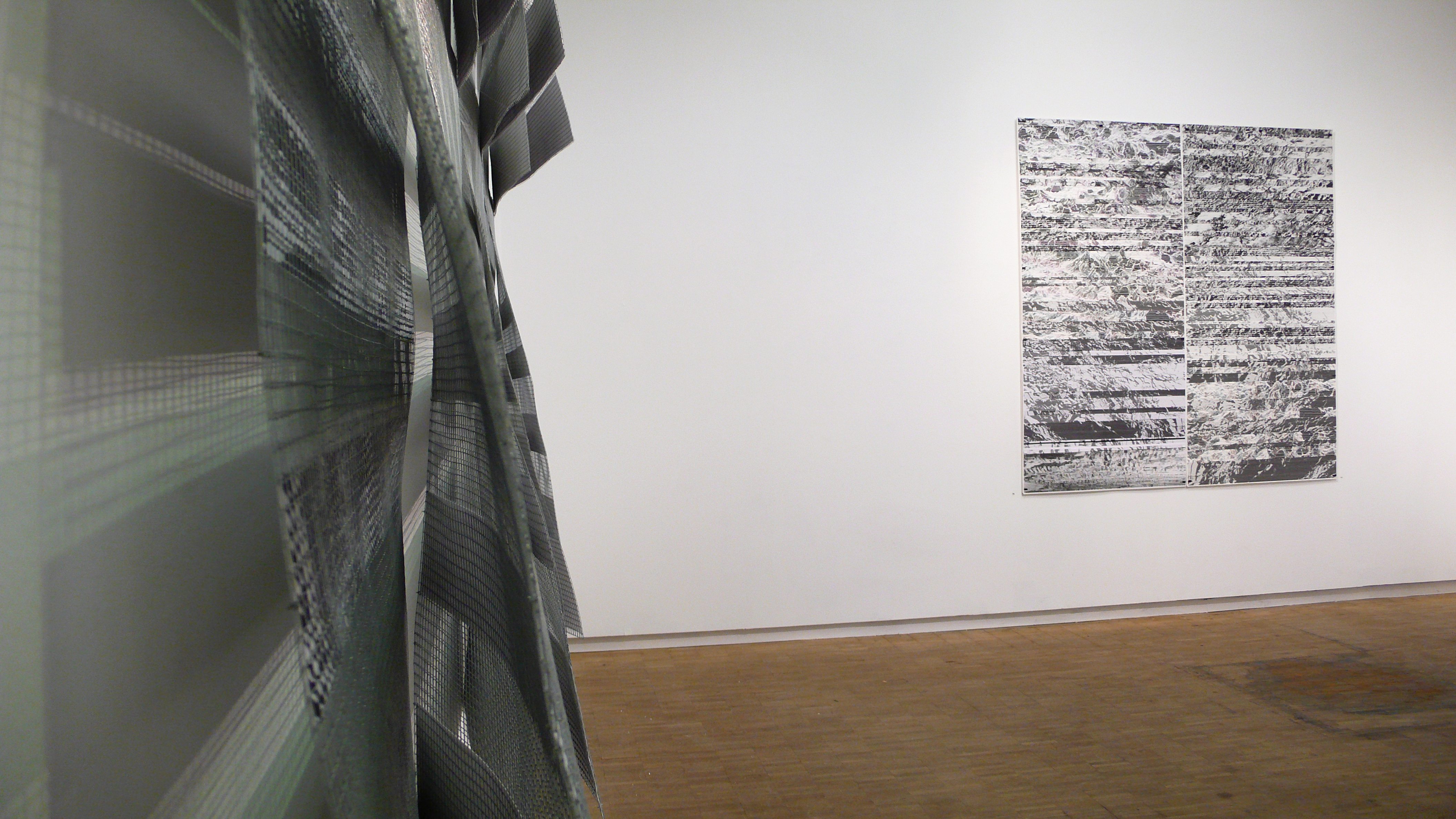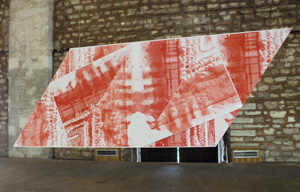 Wojciech Krzywobłockis großformatige und raumgreifende grafische Arbeiten gehen von Fotografien aus. Das Grundmaterial, das Krzywobłocki für seine Arbeit „Zwischen Rot und Weiß“ verwendet, hat er in einer zentralen Müllsammelstelle in Wien aufgenommen.