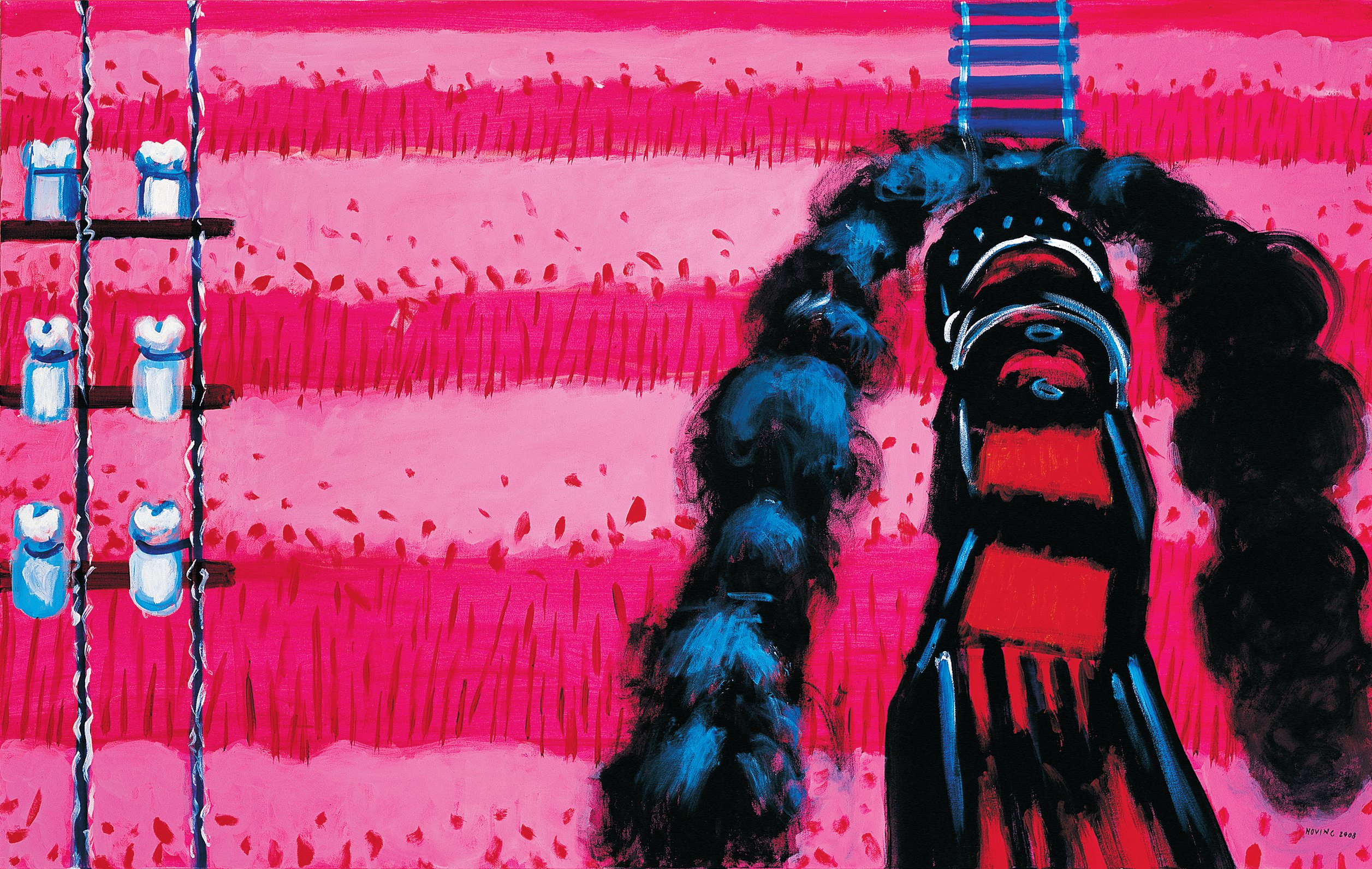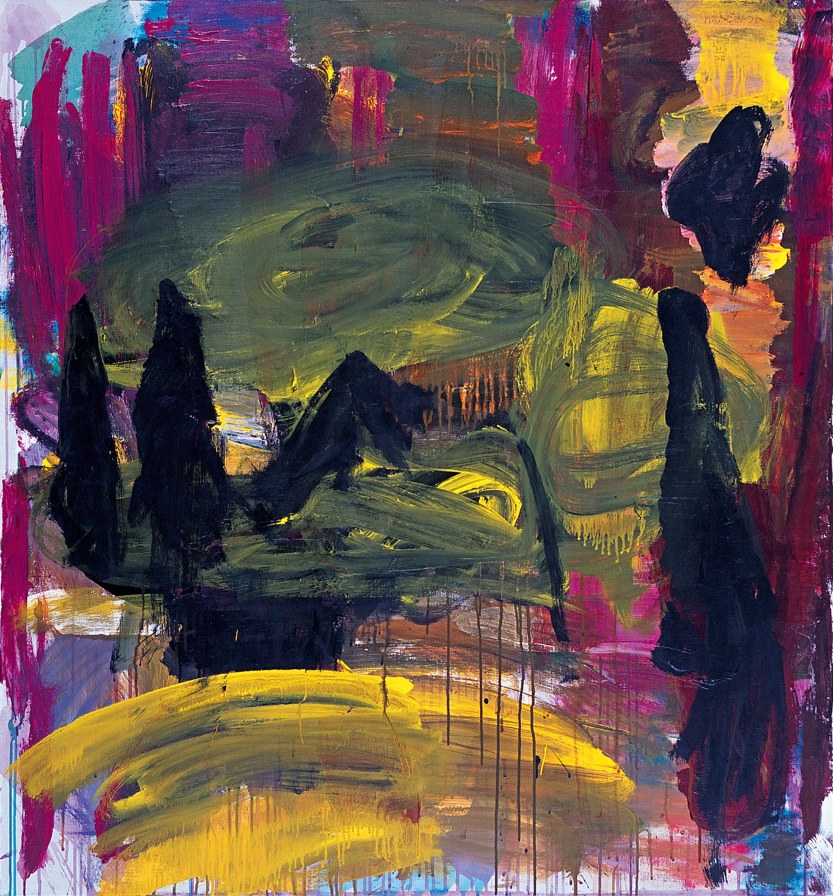 Emerik Bernard trat mit seinen koloristisch üppigen, abstrakten Kompositionen verhältnismäßig spät auf den Plan, Anfang der 80er-Jahre, doch erkannte ihn die Kritik ziemlich schnell als einen der bedeutendsten Vertreter des sog. New Image Painting, einer in der Malerei zutage tretenden Parallelentwicklung zur Architektur des Postmodernismus. Die hier ausgestellten Arbeiten sind im Laufe des letzten Jahrzehnts entstanden und zeugen mit unverminderter Intensität von der enormen, eruptiven koloristischen Kraft, die der Künstler mittels des klassischen Gemäldeformats des Rechtecks bändigt. Das Rechteckformat unterteilt er in der Form von Diptychen oder Triptychen, innerhalb deren wiederum mit mehr oder weniger klar nachvollziehbaren Versuchen die Bildfläche geometrisch rationalisiert werden soll.