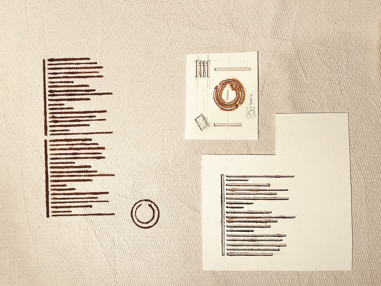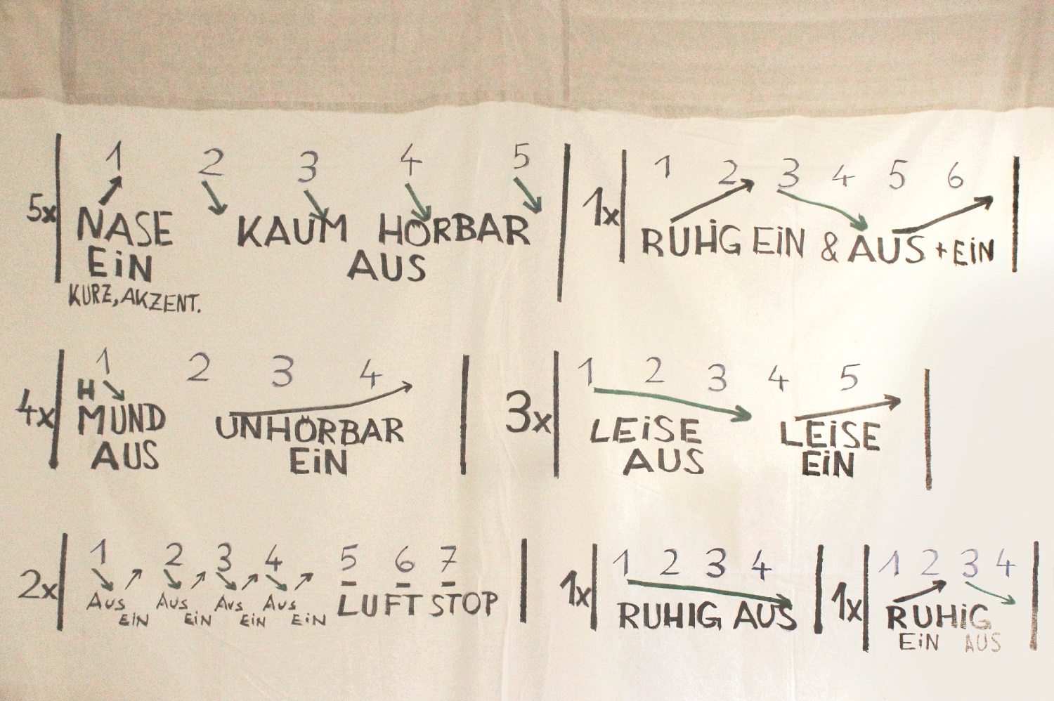 Aus diesem Grundgedanken entstanden einzelne HÖRFENSTER, die zwischen Hörbildern, Kurzhörspielen, Soundwalks und Klangbeobachtungen wechseln (Lautsprecher); dazwischen thematisch fokussierte musikalische und textliche Interventionen (live), verbunden durch leise, akustisch fragile Passagen. Optisch werden unterschiedliche „Fenster“ in den Raum gefügt: an den Wänden Textilarbeiten, einmal Partitur, einmal Gedicht, und eine Serie von Zeichnungen mit Naturfarben, die weitere Zugänge zum Hören eröffnen. Diese Arbeiten folgen im Format den Dimensionen der Wände der Factory. Im Raum einzelne Fensterobjekte.