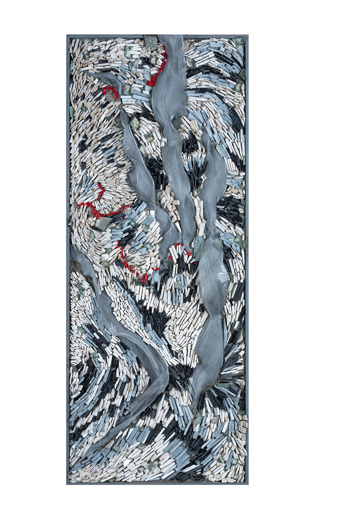 Nun beginnt die Reise, die die Besucher*innen zu einer Wiedergeburt führt: Indem sie dem Verlauf der Mosaiksteine und damit den Noten, also den Emotionen und Stimmungen, folgen, gelangen sie zum letzten Werk: Labyrinthe des Geistes präsentiert mehr und lebendigere Farben, weil dafür goldene und silberne Mosaiksteine aus der Manufaktur Orsoni und venezianische Glasmosaiksteine in verschiedenen Blautönen verwendet wurden. Die aus Terrakotta geformte Augenpartie in der Mitte lädt die Besucher*innen dazu ein, nach innen zu blicken und sich auf den verschlungenen Wegen des eigenen Geistes zu verlieren. Das Werk fordert aber nicht nur zur Selbstbeobachtung auf, sondern veranschaulicht auch den kreativen Prozess, der zu seiner Herstellung geführt hat.