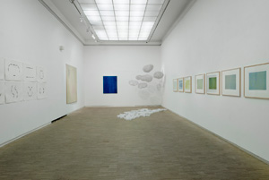 Übertragen auf die Ausstellung von Helga Cmelka und Babsi Daum könnte man von dem sprechen, was zwischen ihren Arbeiten passiert, dem Übergang von einem zum anderen, dem Freiraum, der sich ergibt: Zum Beispiel beim Betrachten der Prägedrucke, die mit wenig Farbe auskommen (Babsi Daum) und den dichten, mehrfarbigen Siebdrucken (Helga Cmelka).