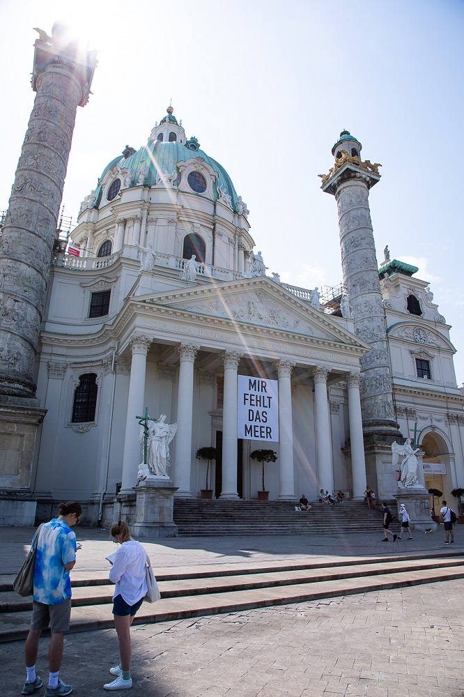 In diesem Sinn kann die Positionierung des Banners an der Wiener Karlskirche nicht passender sein. Seit Jahren steht das Areal des Karlsplatzes in einer Morphose, doch der auf die Ereignisse der letzten Zeit zurückführender Wandel reflektiert besonders auf seine Bedeutung als Ort der Begegnung, des Zusammenfindens, des Entfliehens. Die Zusammenarbeit mit Rektorat St. Karl Borromäus ermöglicht nicht nur die Umsetzung des Projektes, sondern etwas viel Wichtigeres: Es wird ein eindeutiges Zeichen der Begegnung und des Austausches gesetzt.