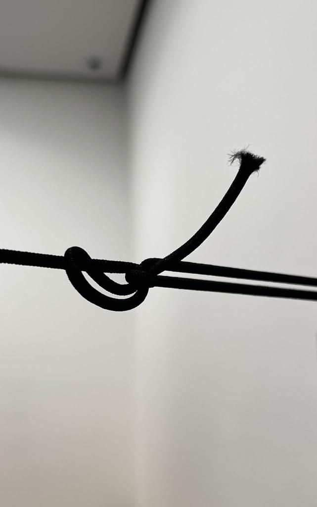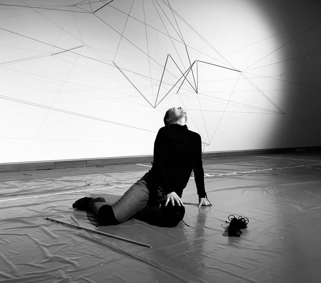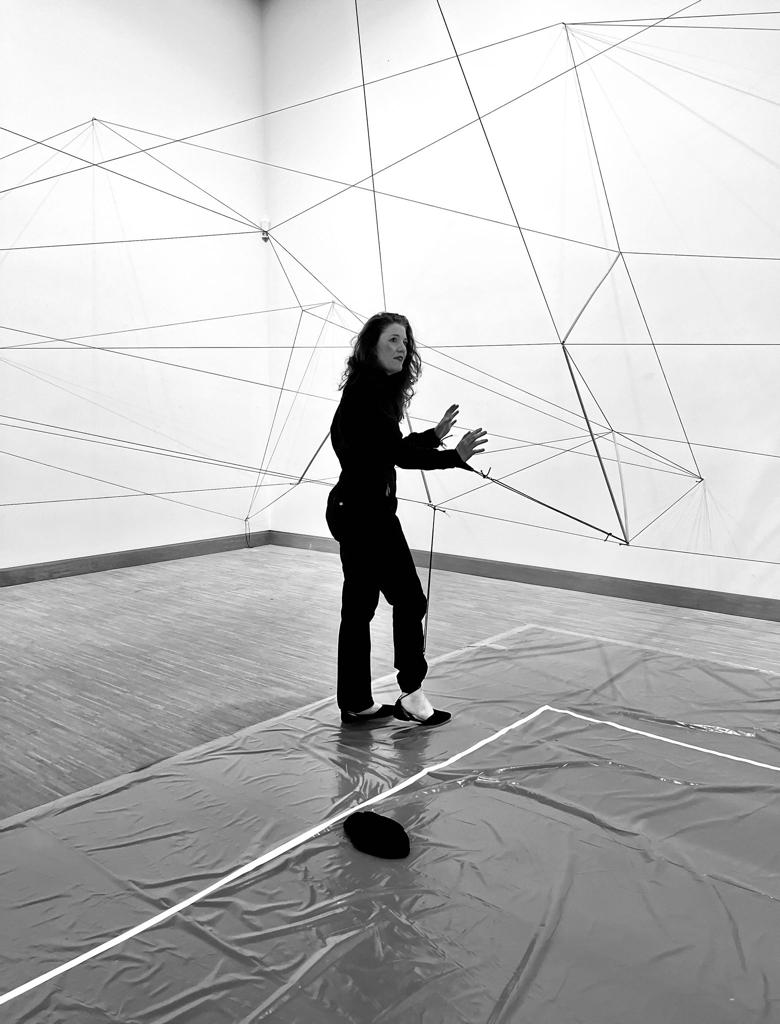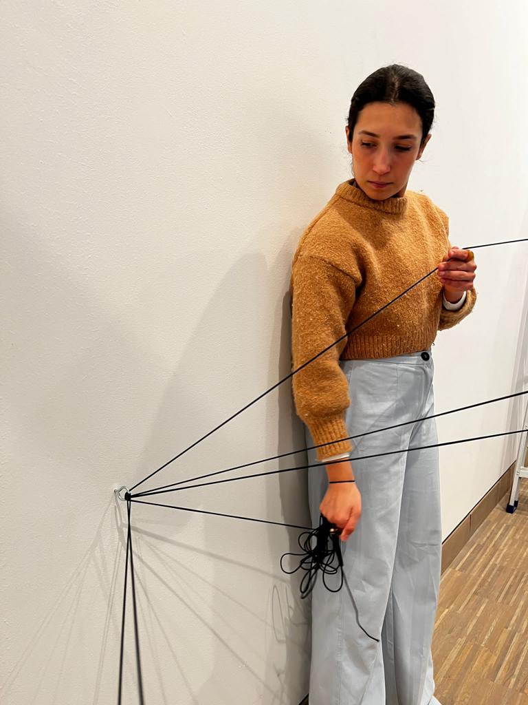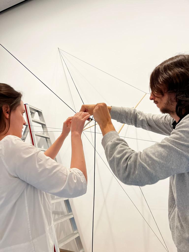 Ein schwarzer Faden wird zur dreidimensionalen Linie. Viele Linien formen eine räumliche Struktur.