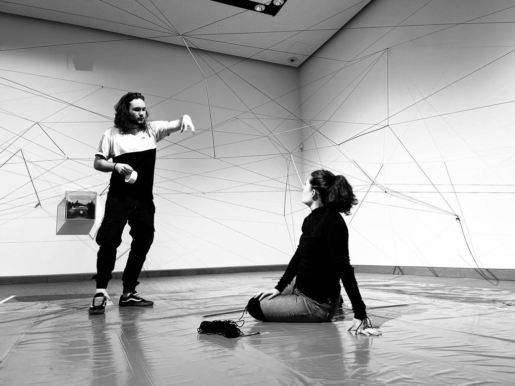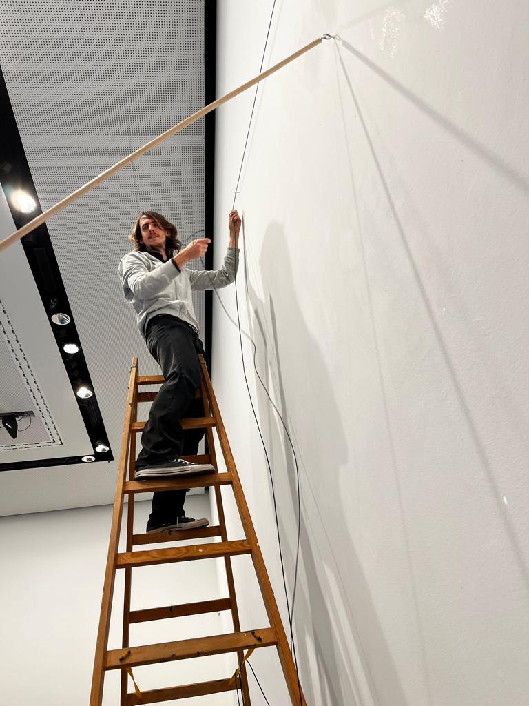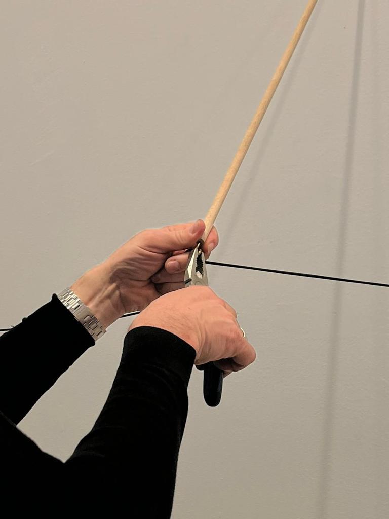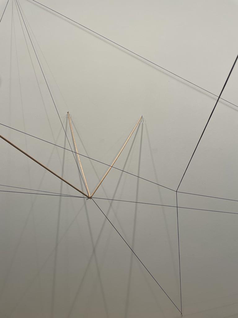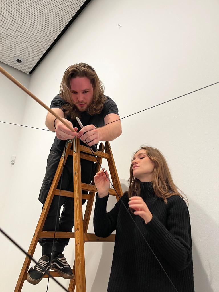 Ein schwarzer Faden wird zur dreidimensionalen Linie. Viele Linien formen eine räumliche Struktur.