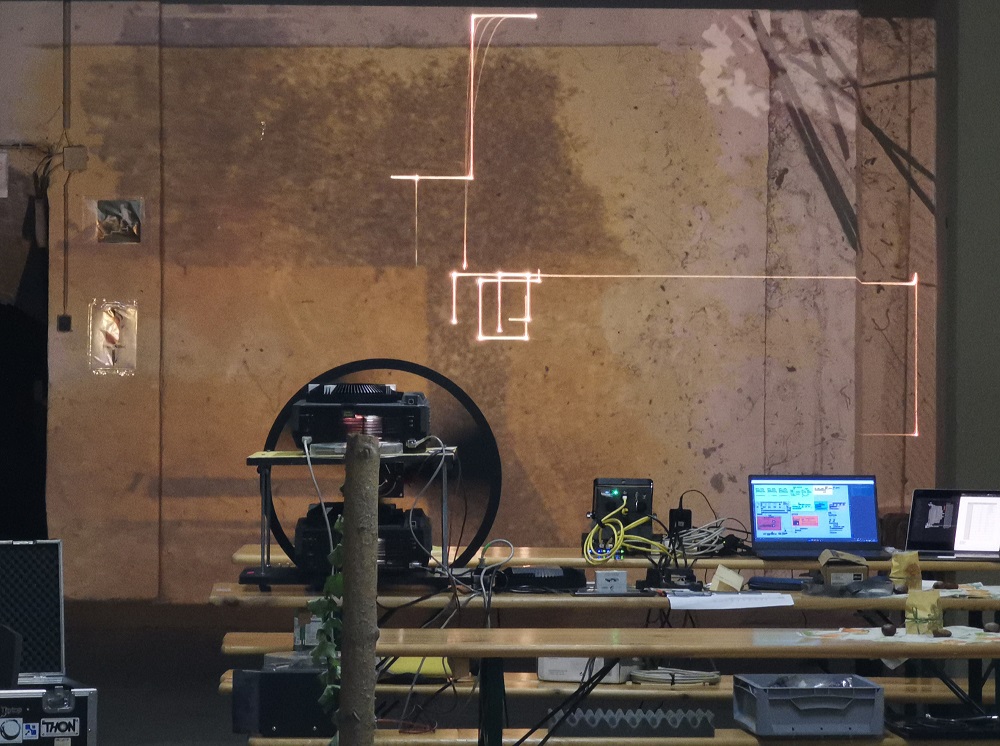 Their new AV performance combines Laser beams generated by algorithms and animated slide projections. The coded Laser traces are inspired by mathematical functions of lorenz attractors creating evolving graphical patterns. These patterns are merged with abstrakt Dia Positives, transparent circuit inlays of everyday electronics and negative high contrast photography. The dia projector apparatus is modified with shutters and moving defraction lenses blending the images into short animations fusing to an immersive, visual experience.