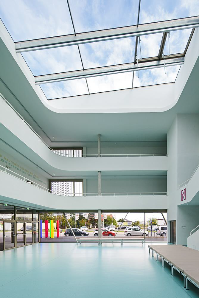 Ein Ziel des architektonischen Entwurfes war es das pädagogische Konzept des „Offenen Lernens“ in ein anspruchsvolles, in vielerlei Hinsicht offenes Raumprogramm zu übersetzen. Das realisierte Schulgebäude ist in modularen Unterrichtsclustern organisiert, durch mannigfaltige Verknüpfungen mit dem Außenraum verwoben und nicht zuletzt auch zur Stadt und zur Gesellschaft hin offen.