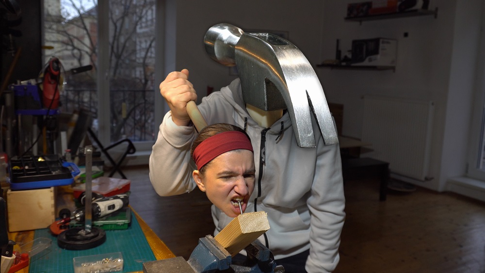 Schon der Titel verspricht, einiges an unharmonischen Details innerhalb der eigenen Persönlichkeit oder des eigenen Selbstverständnisses offenzulegen. Bereits in Anna Vasofs Arbeit Amazon Woman (2021) verlässt sie als Performerin das Terrain der dirigierenden Künstlerin, die ihre Ideen an animierten Abläufen aus- und vorführt. In die lustvolle und phantasiereiche Umgestaltung von alltäglichen Gegenständen oder Abläufen, um die Illusionsmaschine Kino und unser träges Sehen erfahrbar zu machen, mischt sich der unangenehme Verlust der Beherrschbarkeit des Körpers. Subtil greifen nunmehr Elemente des Body Horror Genres um sich. Maschinen bemächtigen sich des physischen Organismus und die Gestalt der Anna Vasof gerät zur fremdbestimmten Marionettenfigur, der die einzelnen Glieder beliebig ausgetauscht oder gar abgetrennt werden können.