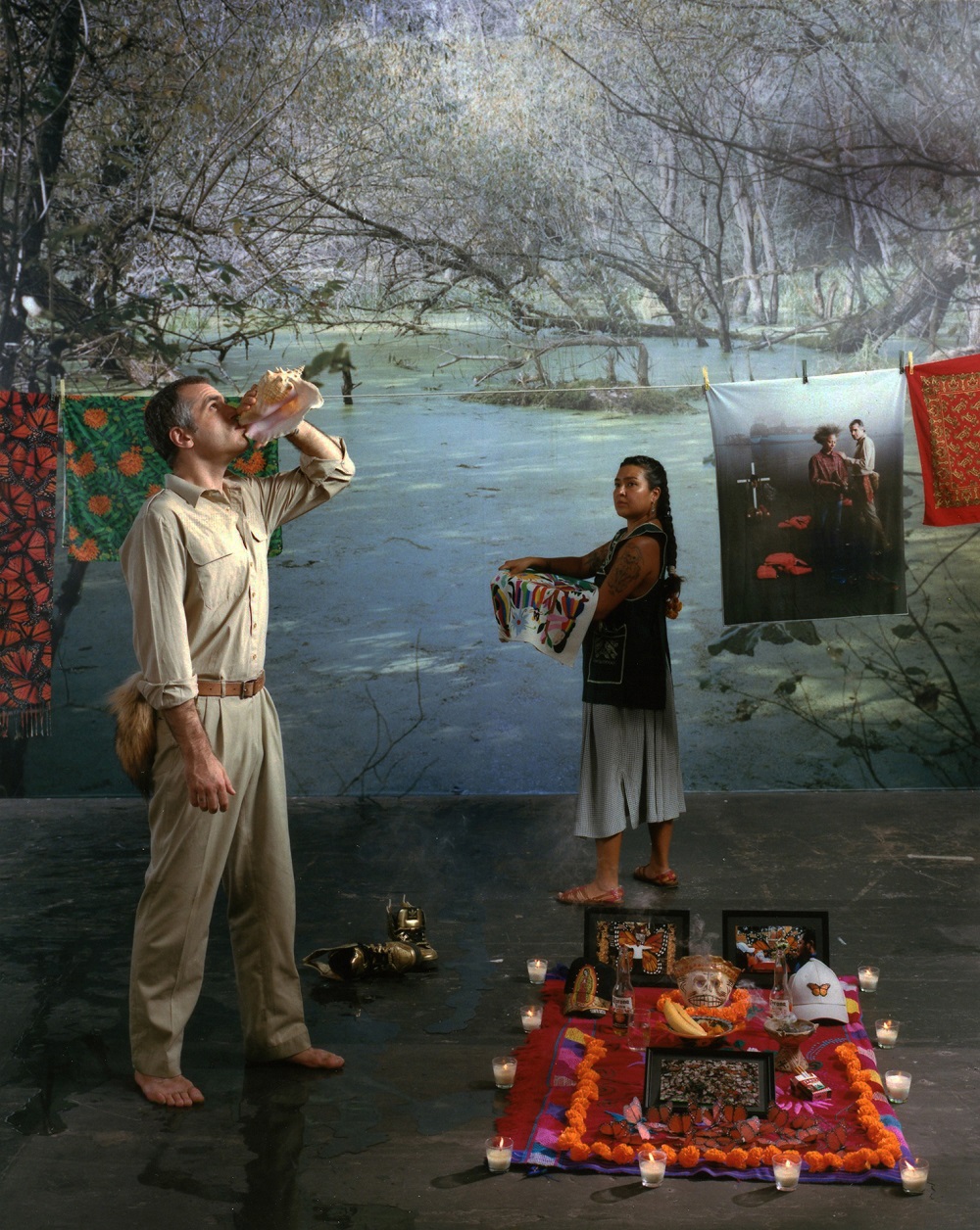 Eine Assemblage aus Körpern, Objekten und Zitaten. Auf einer Bühne werden sichtbare und unsichtbare Grenzen von Darstellern und Tricksern manipuliert und überschritten, die die Idee der ökologischen Gerechtigkeit für Menschen, Monarchfalter und andere wandernde Populationen in einer geteilten Welt verankern.