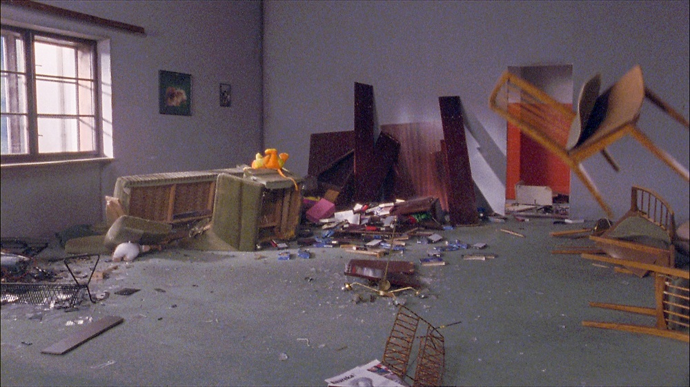 "Was bleibt, wenn nichts mehr bleibt und das Leben buchstäblich auf den Kopf gestellt wird? Dropping Furniture fixiert zunächst zwei leere Zimmer. Leise, kaum wahrnehmbare Sounds erzeugen subtilen Suspense. Nach einigen Sekunden, wenn wir uns fast schon an die existenziell anmutende Leere der scheinbar verlassenen Behausung gewöhnt haben, fallen von oberhalb des Bildrands in Slow Motion zwei Einrichtungsgegenstände in das hintere Zimmer. Dann schwebt im vorderen, großen Zimmer ein Kronleuchter zu Boden, zersplittert und gibt das Startsignal für eine durch zwei fixe Einstellungen strukturierte Choreographie der Zerstörung. Wie von Geisterhand schweben ein Sofa, Leselampe oder ein Sessel mit Stofftieren darnieder. Das Mobiliar eines offenkundig altmodischen, spießigen Wohnzimmers wird entsorgt, um am Boden, orchestriert von einer mit dem verlangsamten Bild synchronisierten, mit viel Hall ausgestatteten Tonspur zu zerbersten. Als schließlich der gewichtige Wandverbau zerschellt ist, beginnt ein Telefon in Echtzeit zu läuten - ein letzter Hinweis auf Kommunikation. Auch die gegen Ende herab fallenden Zimmerpflanzen und das Aquarium geben keine Aufschlüsse auf Urheber und Motivation dieses Aufkündigungsrituals, das eine hintergründige Pointe birgt. Zwar entledigt man sich hier, ähnlich des Klischees von Fernseher aus dem Fenster werfenden Rockstar, in einem Akt der destruktiven Befreiung einer erstickenden Dingwelt. Andererseits beschweren genau die Trümmer den leeren Raum von neuem, füllen ihn mit dem sich ausbreitenden Müll der eigenen Geschichte. Am Ende, nach der Schwarzblende, glauben wir, weitere am Boden aufprallende Gegenstände zu hören. Sie klingen wie das Donnergrollen eines reinigenden Gewitters." (Thomas Edlinger)