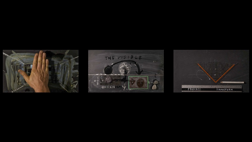 „Eine Kreidelinie kreuzt den Bildschirm, macht eine Schleife und setzt ihren Weg fort. Beginnen Sie mit der Auswahl und Einrahmung eines Fragments, nehmen Sie eine Probe und messen Sie. Dann führen Sie die Studiomaterialien (Papier, Kreide, Wasser, Glas), die gefundenen Materialien ( Holz, grünes Blatt) und die eingeladenen Materialien (Schnecken) hin zu Sinnlichkeit, schematischer Rationalisierung oder der Beobachtung der verschiedenen Maßstäbe des Lebendigen durch Sammeln, Experimentieren und Analysieren werden die drei Videos von Nikolaus Gansterer von einer Klangkomposition von Martin Siewert entstand in seinem Studio, während er unter anderem wissenschaftliche Radiosendungen hörte. Untertagüberbau ist eine Videoaufzeichnung von Gesten rund um einen Labortisch. Diese Produktion leitete die Praxis des „Trans-Lesens“ ein. Kommentieren von Sitzungen, die in Situationen des direkten Zuhörens stattfinden, erfolgt durch glückliche Zufälle, nachträgliche Gedanken, das Springen von der Säule zur Säule, das Kommen und Gehen, das Zusammenbrechen und das Auftauchen. Es ist unmöglich, sich sehr lange zu konzentrieren. Die Zerbrechlichkeit eines Staates ist wie ein Windstoß auf einem Fragment.“ (Sophie Orlando)