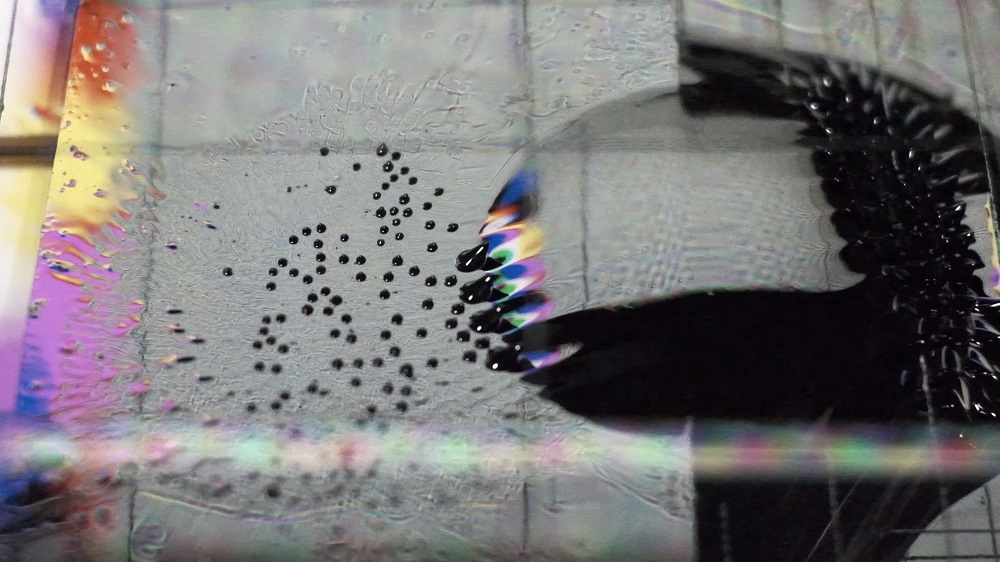In his most recent moving image work, text modules from Esther Leslie's book Liquid Crystals (keyword: political aesthetics) serve as a source of inspiration; the visual level is populated by sensual amorphous figures that emerge with aesthetic precision as if by magic. Similar in method to his video Thinner than two ten-thousandths of a millimeter (2020, 8 min), which can also be seen on this evening, various framing devices, reflections and a self-made object equipped with a magnetic field and ferrofluid oil create a visual-aesthetic language that appears animated or computer-generated, although it is completely analogue. These are, so to speak, cinematic chambers of wonder that have fallen out of time, which visually simulate digital technologies but are in reality analog manual work. A series of large-format paintings, primarily in black, white and gray, showing (delicate) geometric figures, contrast with two short films and an installation. There will also be a little talk, questions are welcome.
