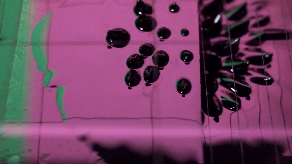 In seiner jüngsten Laufbildarbeit dienen Textbausteine des Buchs Liquid Crystals von Esther Leslie (Stichwort: politische Ästhetik) als Inspirationsquelle, die visuelle Ebene bevölkern sinnliche amorphe Figuren, die sich wie von Geisterhand in ästhetischer Präzision herausschälen. Von der Methode ähnlich wie in seinem, ebenfalls an diesem Abend zu sehenden Video Dünner als zwei Zehntausendstel eines Millimeters (2020, 8 min) sorgen auch hier diverse Rahmenvorrichtungen, Spiegelungen und ein selbstgebautes, mit einem Magnetfeld und Ferrofluid Öl ausgestattetes Objekt für eine bildästhetische Sprache, die animiert bzw. computergeneriert anmutet, obwohl sie völlig analog vonstatten ging. Es handelt sich sozusagen um aus der Zeit gefallene, filmische Wunderkammern, die visuell digitale Technologien simulieren, in Wirklichkeit aber analoge Handarbeit sind. Eine Reihe von großformatigen, primär in schwarz/weiß/grau gehaltenen Malereien, die (filigrane) geometrische Figuren zeigen, kontrastieren an diesem Arbeit zwei Kurzfilme und eine Installation. Ein wenig geredet wird auch, Fragen sind erwünscht. (Dietmar Schwärzler)