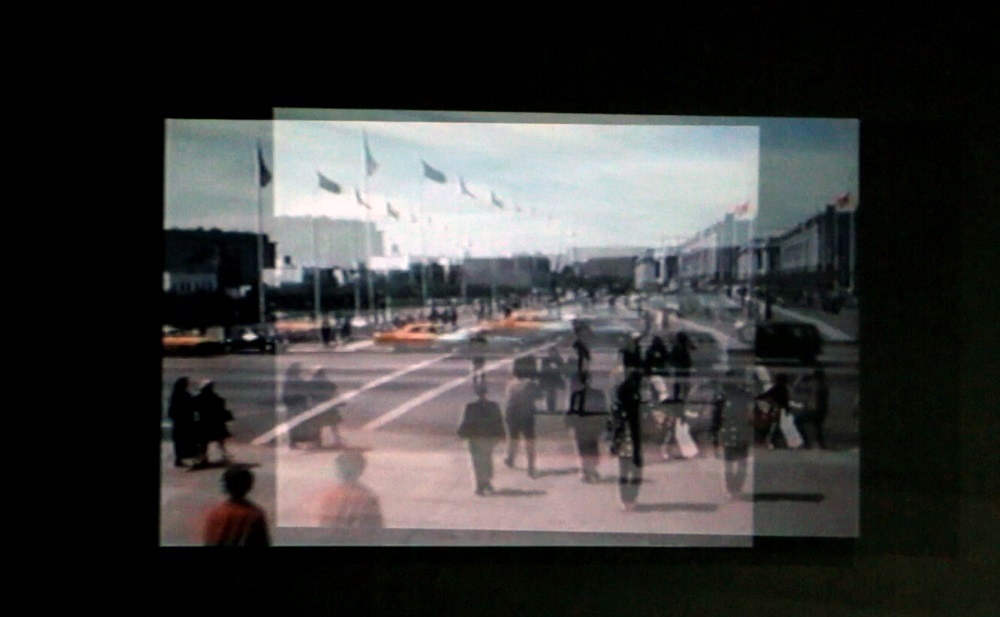 Im Video NOON FOREVER (2018, 13 min), das als Installation gezeigt wird, sind es Szenen des Dokumentarfilms NOWSREAL (1968) von Peter Berg und Kelly Hart, der mit aktiver Teilnahme des in San Francisco operierenden Kollektivs (1966 bis 1968) The Diggers entstand. Fern aller kapitalistischen Logiken setzte sich diese Aktionsgruppe von Gemeinschaftsanarchist*innen für Gratisküchen, kostenlosen Wohnraum und freie Arztpraxen ein, installierte aber auch Geschäfte, in denen es alles umsonst gab. Für das formal bestimmende, durchgehend rotierende Bild im Video baute Eldarb ein Objekt, das aus zwei Glaspaneelen und einer Drehplatte bestand und zeichnete die Reflexionen des Monitors/Films, der sich auf der Platte drehte, in einer Glasspiegelung auf. Klingt kompliziert, funktioniert aber einfach.