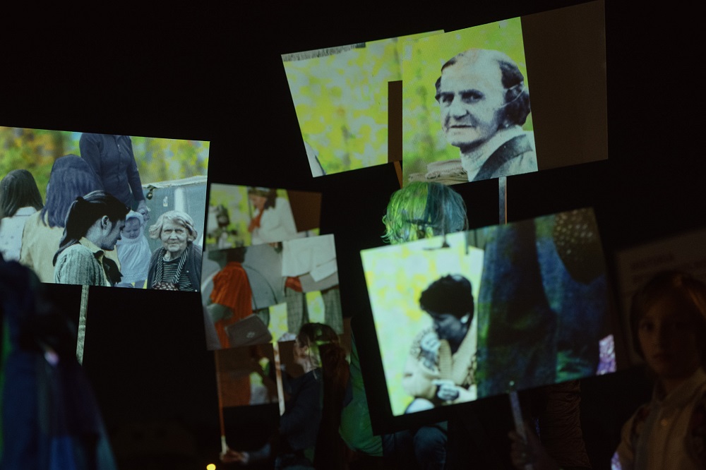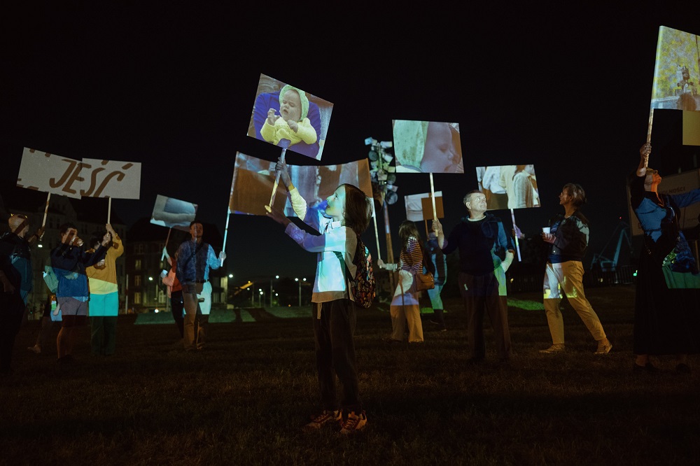 documentation of the performative action that engaged viewers into a creative process of a projection installation. Live protest in context of historical events, the old claims becoming up-to-date.
