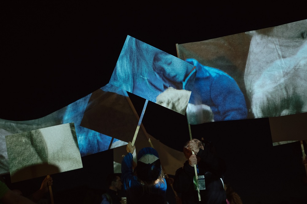 Dokumentation der performativen Aktion, die Zuschauer*innen in den kreativen Prozess einer Projektionsinstallation einbezog.