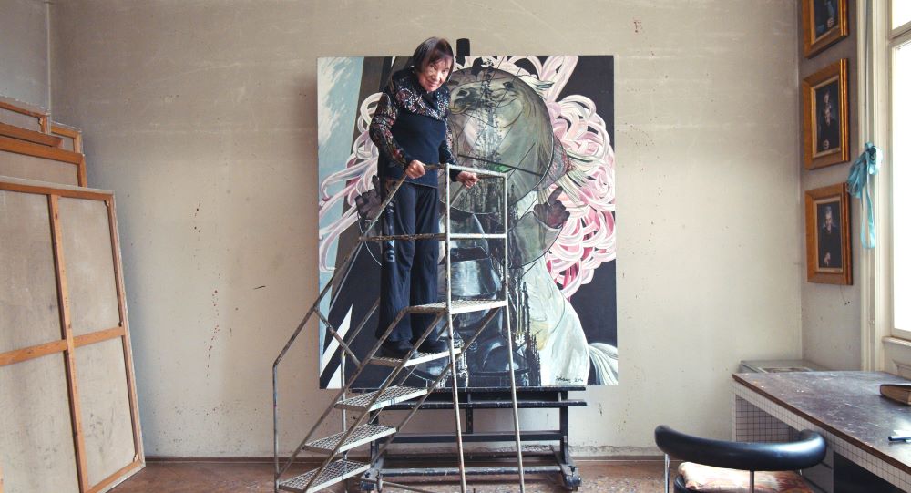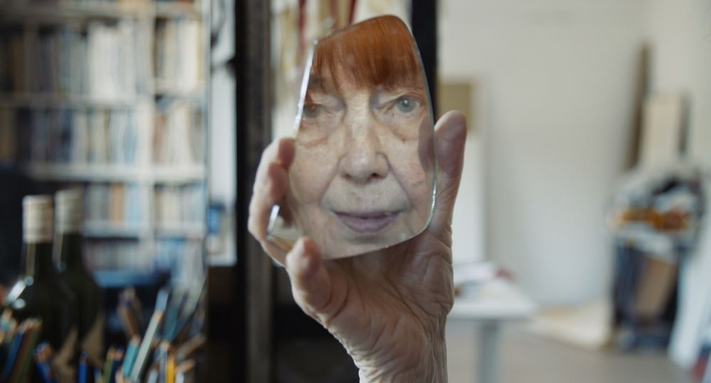 Isolde Maria Joham – die Frau im Bild – steigt auf ein Rollgerüst. Ganz sachte nimmt sie eine Stufe nach der anderen, bis sie fast ganz oben steht, dann streckt sie ihren Daumen hoch und blickt verschmitzt lächelnd in die Kamera. In streng kadrierten Bildausschnitten zeigt Christiana Perschon die 90jährige Künstlerin, wie sie dieses Gerüst performt, immer wieder durch seine Verstrebungen hindurch in die Kamera blickt. So zart und zerbrechlich Joham wirkt, sosehr beherrscht sie noch immer dieses Werkzeug, mit dem sie in all den Jahren umzugehen gelernt hat. Ihre Gemälde sind auch noch da, jedoch im Hintergrund. Sie umfangen die Künstlerin und ihr Gerüst gleichsam als zweiter Rahmen – den dritten bildet die Kadrage Perschons. Dabei kommt es zu wunderbaren Überlagerungen und Korrespondenzen zwischen der Künstlerin und ihrem Werk. So wird sie etwa einmal beinahe zu jenem Roboter, der metallisch und doch fragil hinter ihr ein Feld von üppigen Blumen durchwandert. (Claudia Slanar)