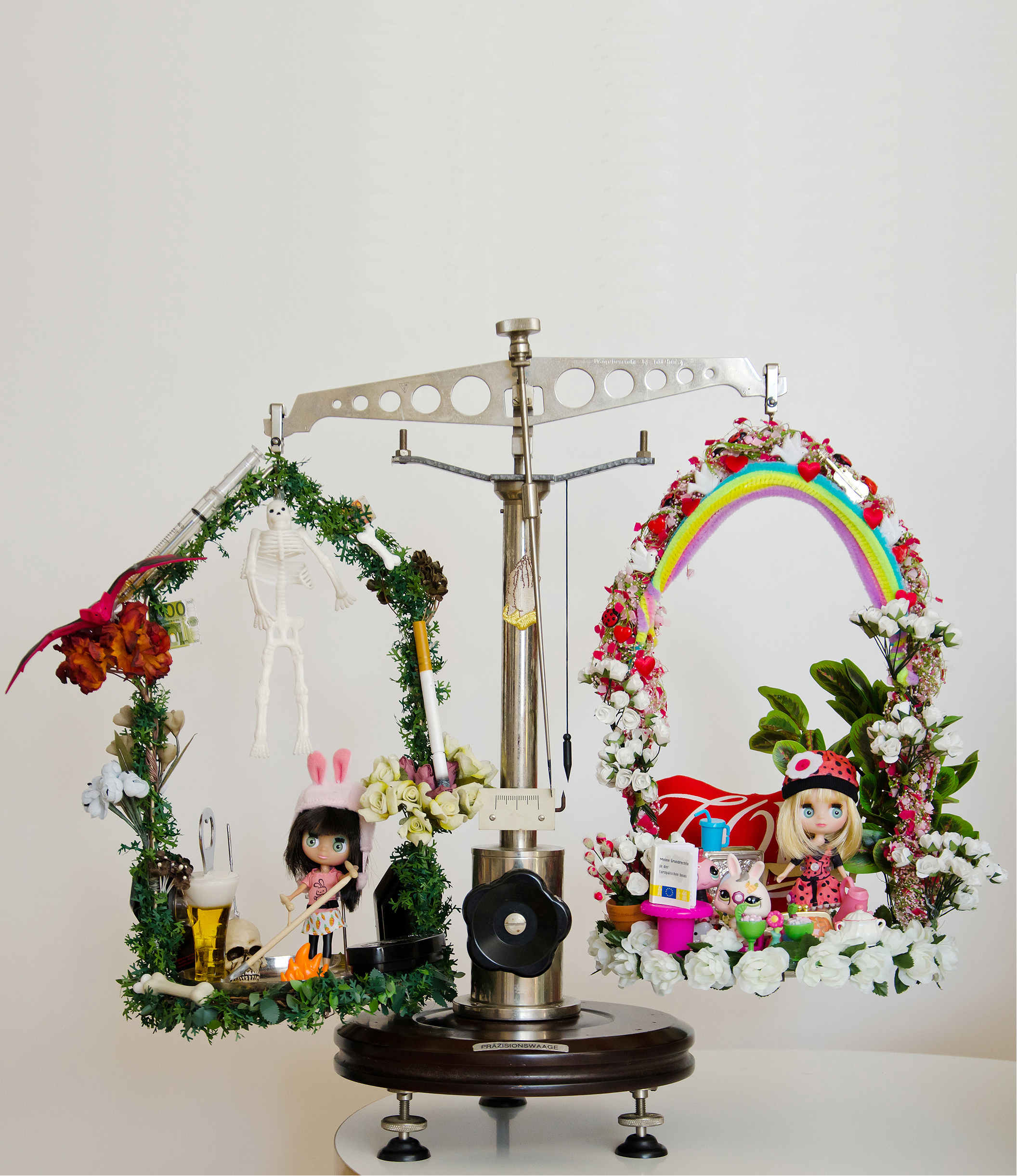 Susanne Hornbostel, Gut-Böse-Waage, 2013, Objekt aus Fundmaterialien, 48 x 55 x 21 cm