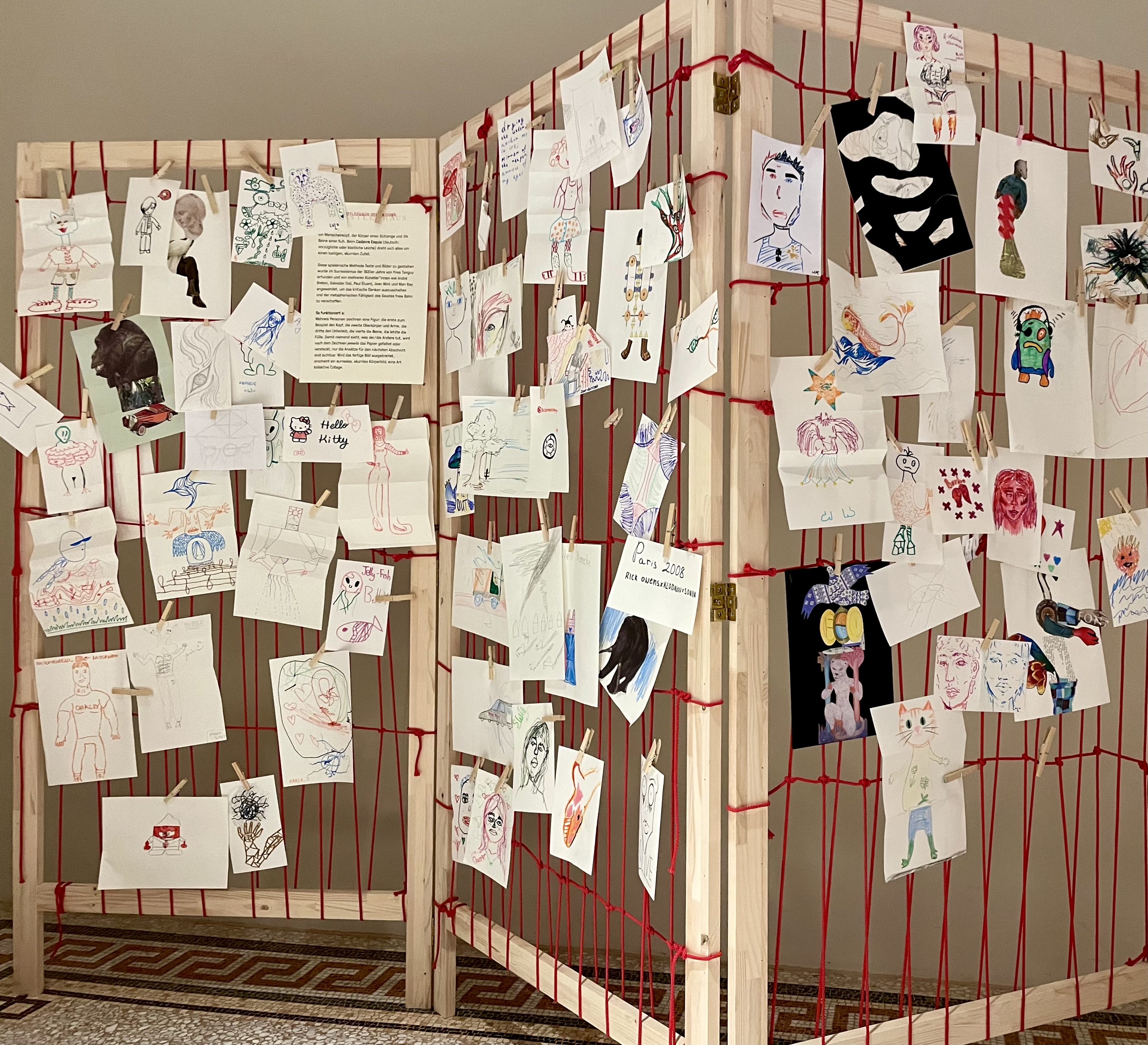 Der Raum lädt zum Innehalten ein, nach oder während dem Besuch der Ausstellung. Entdeckt verschiedene Materialien, lasst euch inspirieren und werdet selbst aktiv, schafft etwas Eigenes mit euren Händen. Die Eindrücke und Bilder, die während dem Ausstellungsbesuch auftauchen, könnt ihr hier festhalten. So entsteht über die Dauer der Ausstellung ein Gesamtkunstwerk aller Besucher*innen – jede/r arbeitet für sich und doch gemeinsam.